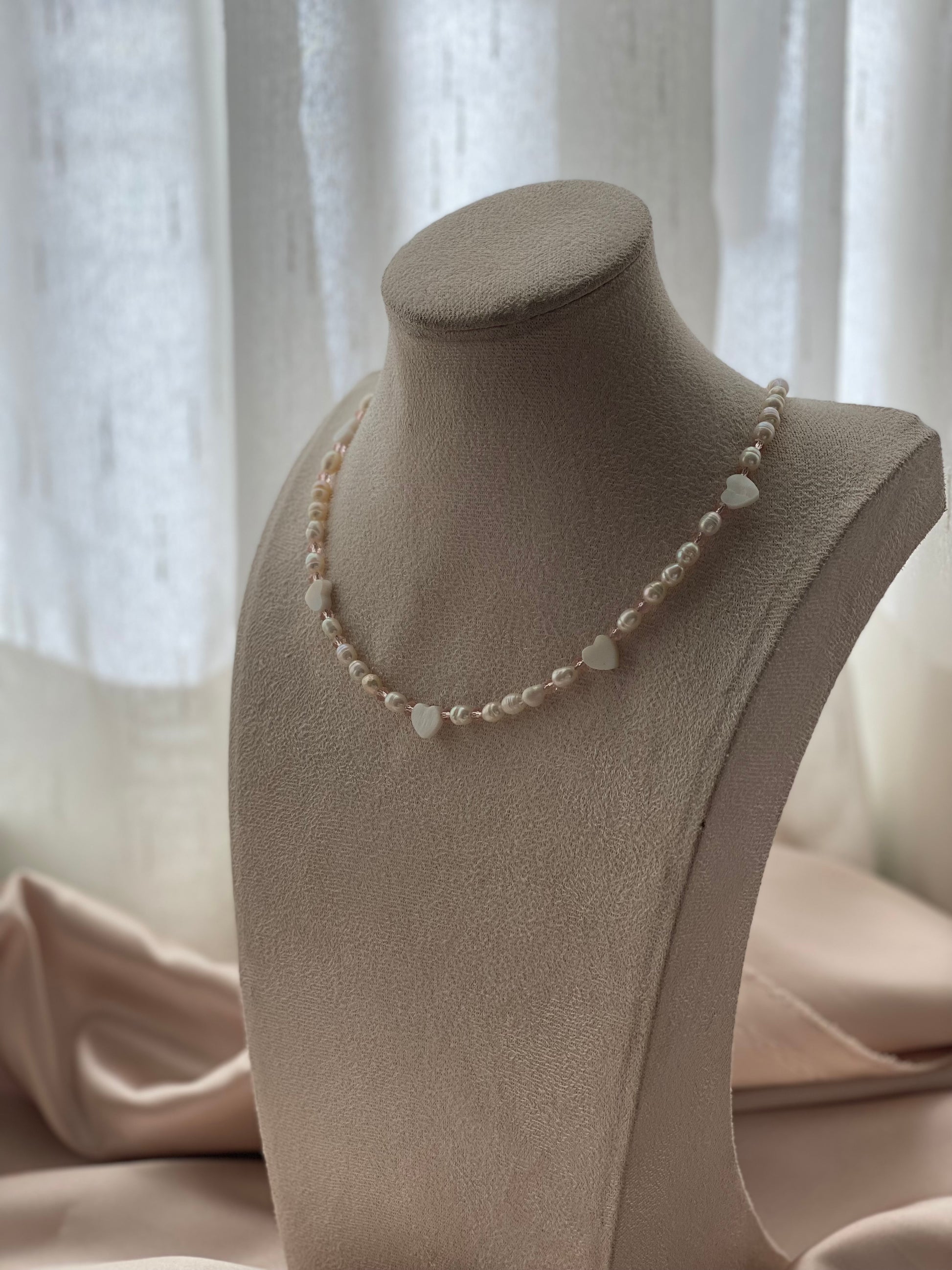 this hand beaded sea pearl necklace complete with pink crystals and pearlized hearts is perfect